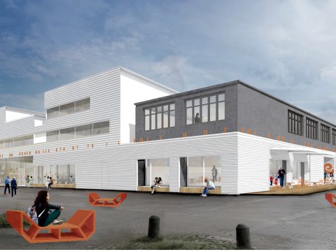 Entkernung, Umnutzung sowie Aufstockung um 2 Geschosse der vorhandenen Schule. Tiefgarage mit 51 Stellplätzen zwischen den Gebäuden, Erstellung von Wohn- und Gewerbelofts